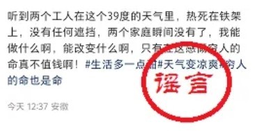 7月6日,有网民在某网络平台发布信息称“听到两个工人在这个39度的天气里,热死在铁架上,没有任何遮挡,两个家庭瞬间没有了,我能做什么啊,能改变什么啊,只有在这感慨穷人的命真不值钱啊”。